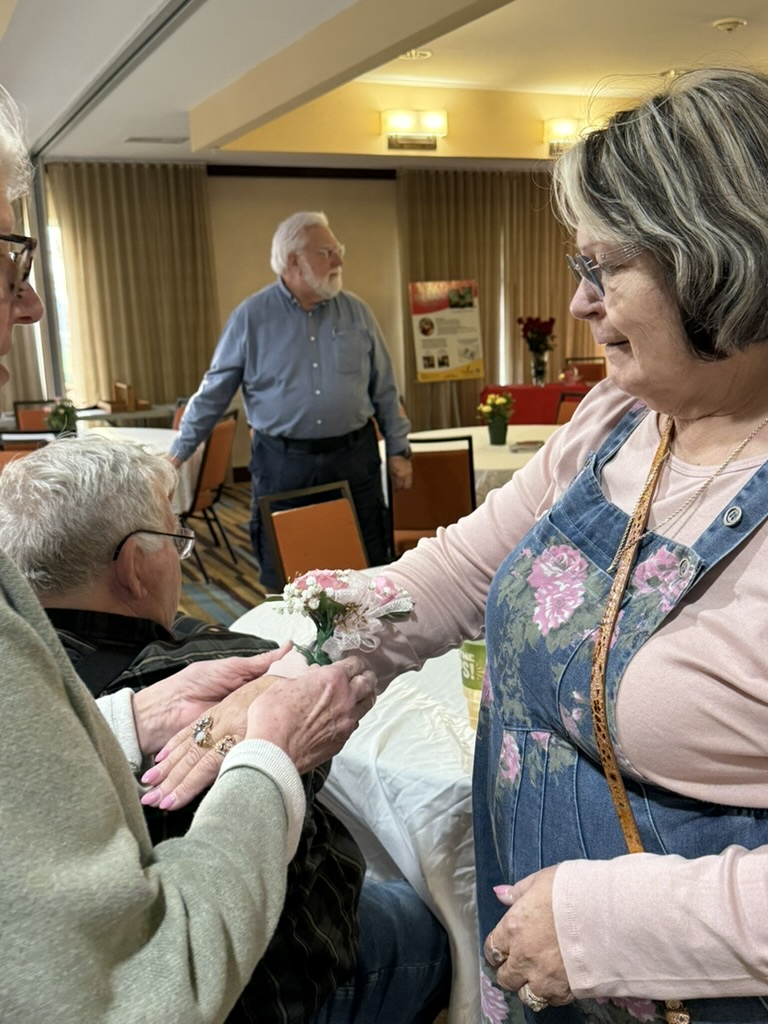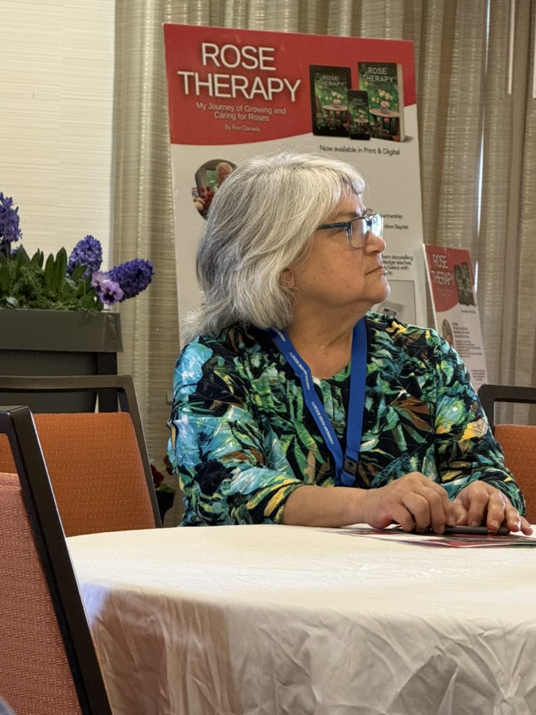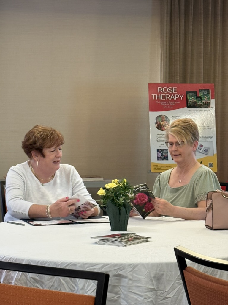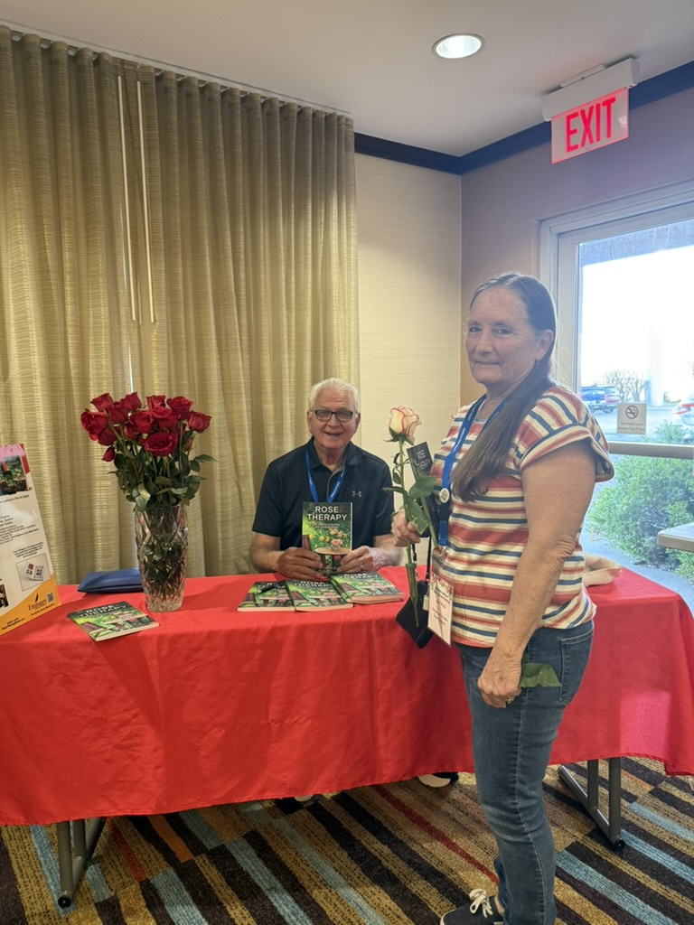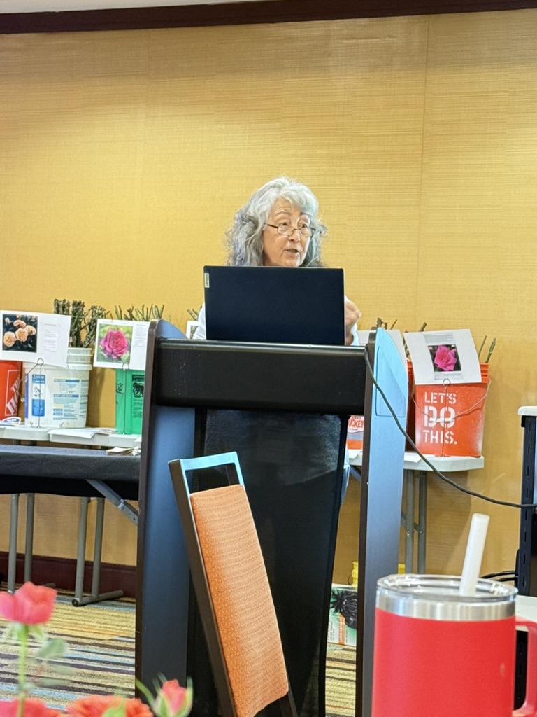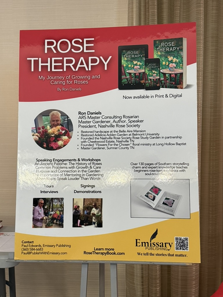 Ron Daniels took us back to the basics and beyond, sharing his tips and tricks of a lifetime of growing roses. He also inspired us to look at sharing our gardens differently. Ron gives the gift of an “open garden. He shared beautiful stories of those who have come — many coming when they were in their last stage of life and wanted the comfort of being in a garden. He shared that passersby often stop to ask a question or take a picture. I think most of us gasped when he shared that on one day of a recent open garden, he had 350 guests. Ron lives out his passion and ministry to share his love of growing roses with others. We also had the opportunity to purchase Ron’s book, Rose Therapy.